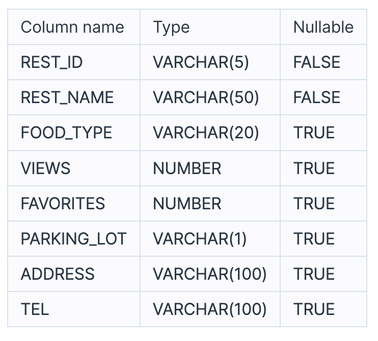 다음은 식당의 정보를 담은 REST_INFO 테이블과 식당의 리뷰 정보를 담은 REST_REVIEW 테이블입니다. REST_INFO 테이블은 다음과 같으며 REST_ID, REST_NAME, FOOD_TYPE, VIEWS, FAVORITES, PARKING_LOT, ADDRESS, TEL은 식당 ID, 식당 이름, 음식 종류, 조회수, 즐겨찾기수, 주차장 유무, 주소, 전화번호를 의미합니다.